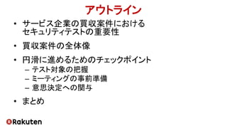 アウトライン • サービス企業の買収案件における セキュリティテストの重要性 • 買収案件の全体像 •