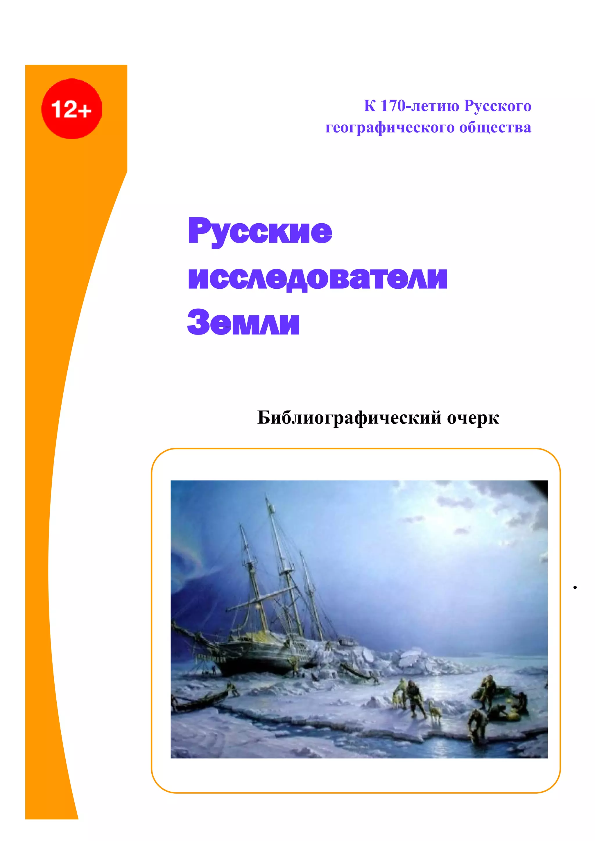 Документ представляет библиографический очерк, приуроченный к 170-летию Русского географического общества, и содержит информацию о знаменитых русских исследователях земли с древней Руси до современности. Он включает хронику открытий и путешествий в различных регионах, таких как Сибирь, Дальний Восток и Русская Америка, а также упоминает вклад известных географов и мореплавателей. Издание предназначено для широкой аудитории и использует интернет-ресурсы для более подробного изучения биографий исследователей.