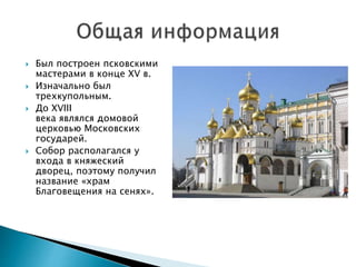Документ описывает историю Благовещенского собора, построенного в Пскове в конце XV века и изначально трехкупольного. В разные периоды он подвергался перестройкам, включая изменения во время правления Ивана IV, когда собор стал девятиглавым и получил роспись известных мастеров. Также упоминаются значимые иконы, связанные с русской историей, такие как икона Донской Богоматери.