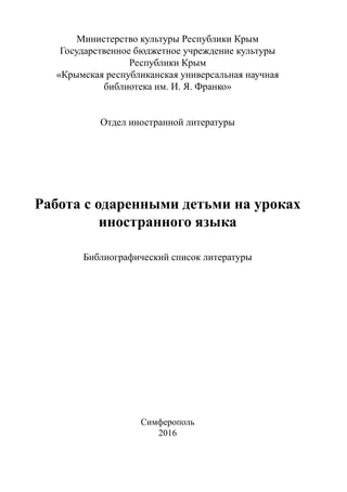 Документ представляет собой библиографический список литературы, посвященный работе с одаренными детьми на уроках иностранного языка. В нем рассматриваются различные аспекты лингвистической одаренности, проблемы и подходы к обучению и взаимодействию с талантливыми учащимися. Основная цель списка — предоставить информацию для педагогов и специалистов, работающих с одаренными детьми, с учетом новых тенденций в образовании.