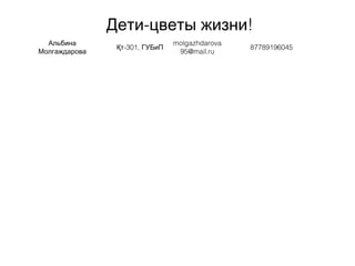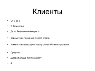 Документ рассматривает проблемы и потребности детей в Казахстане, включая их творческие интересы и стремление к познанию. Упоминается недостаток времени, проводимого родителями с детьми, что может приводить к агрессии или замкнутости у детей. Также отмечается влияние финансовых факторов и возможные препятствия со стороны родителей.