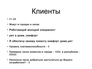 Документ содержит информацию о целевой аудитории для бизнеса в сфере дизайна интерьера, включая характеристики клиентов, их потребности и проблемы. Основные вызовы клиентов связаны с недостатком образования и связей в данной сфере. Также обсуждаются причины неудовлетворенности и способы, которыми клиенты пытаются решить свои проблемы.