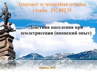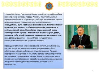 Документ обсуждает подготовку населения Алматы к землетрясениям, подчеркивая важность обучения и изучения японского опыта в этой области. Президент Назарбаев наметил необходимость возобновления образовательных программ и планов эвакуации для достижения культурной безопасности. Учитывая сейсмоопасность региона, документ также содержит рекомендации по действиям в случае землетрясения для населения и описание пунктов сбора для пострадавших.