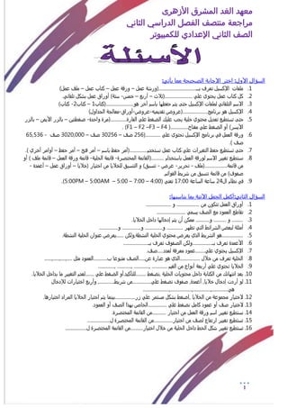 تتناول هذه الوثيقة مراجعة لمحتويات الفصل الدراسي الثاني للصف الثاني الإعدادي في مادة الكمبيوتر، حيث تتضمن مجموعة من الأسئلة والإجابات المتعلقة ببرنامج الإكسل. تتضمن موضوعات مثل كيفية استخدام الوظائف الأساسية للإكسل، وتنظيم البيانات داخل أوراق العمل، بالإضافة إلى بعض المهارات المتعلقة بالتنسيق وإدارة الملفات.
