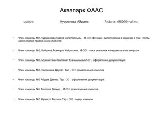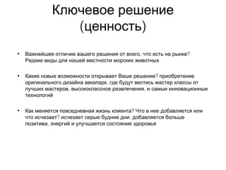 Документ описывает план команды аквапарка Фаас по привлечению клиентов и конкурентному анализу. Основное решение включает уникальное предложение в виде редких морских животных и мастер-классов от лучших специалистов, что добавляет позитивные эмоции в повседневную жизнь клиентов. Преимущества заключаются в улучшенной юзабилити, более дешевом и быстром обслуживании, а также удобном расположении.