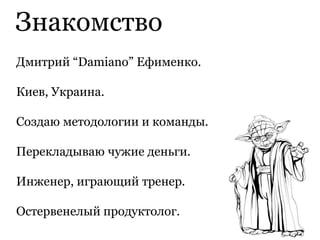 Документ представляет собой презентацию Дмитрия Ефименко о качестве работы продуктовой команды и методологиях управления проектами. Обсуждаются ключевые ценности, процессы и жизненный цикл продуктов, акцентируя внимание на важности четких целей и адаптивности команды. Также затрагиваются проблемы деградации и необходимость системного подхода к управлению проектами.