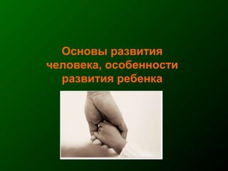 Документ освещает основы человеческого развития через призму генетики, акцентируя внимание на механизмах функционирования клеток и эволюции. Рассматриваются различные генетические аспекты, включая медицинскую генетику и наследственные болезни, а также этапы эмбрионального и постнатального развития. Включены статистические данные по наследственным заболеваниям и описаны характерные синдромы с хромосомными аномалиями.