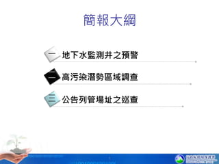 该文档详细介绍了地下水监测井的预警、巡查以及高污染潜势区域的调查方法,强调定期检查和监测以防止污染。文中提供了全国家地下水质量的数据,展示了对高污染潜势场所的监测和治理进展。最后,文档呼吁加强对农地的巡查,以确保土地和食品安全。