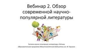 Вебинар 2 обсудил современную научно-популярную литературу для детей, охватывая разнообразие издательств и совместные проекты между авторами и научными учреждениями. Обсуждались новшества в визуализации, форматы книг, такие как комиксы, и ошибки в познавательных изданиях. Участники были призваны создать рекомендательный список детских литературы по категориям "очень рекомендую", "нейтрально" и "вообще не рекомендую".