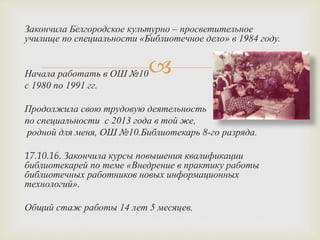 Документ описывает деятельность школьной библиотеки и её заведующей, Галины Викторовны Синсиповой, с акцентом на воспитание информационной культуры и любви к чтению среди учеников. Библиотека реализует множество мероприятий, включая акции, выставки и конкурсы, чтобы поддержать читательские навыки и развивать библиотечную среду. Заведующая библиотеки подчеркивает важность новых форм работы и создания комфортной атмосферы для учеников.
