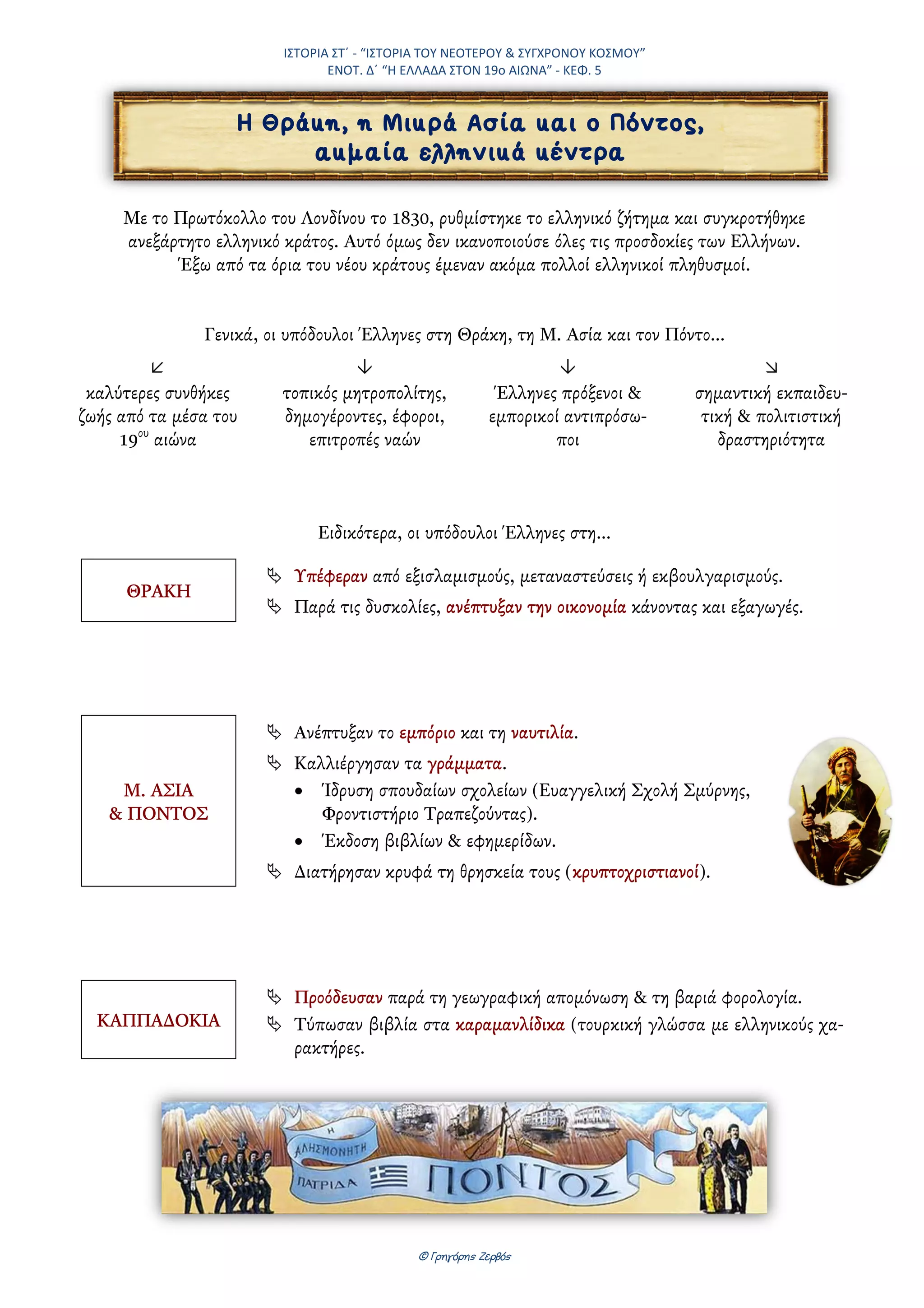 “ΙΣΤΟΡΙΑ ΤΟΥ ΝΕΟΤΕΡΟΥ & ΣΥΓΧΡΟΝΟΥ ΚΟΣΜΟΥ” ΕΝΟΤ. Δ΄ “Η ΕΛΛΑΔΑ ΣΤΟΝ 19ο ΑΙΩΝΑ” - ΚΕΦ. 5 © Γρηγόρης Ζερβός Με το Πρωτόκολλο του Λονδίνου το 1830, ρυθµίστηκε το ελληνικό ζήτηµα και συγκροτήθηκε ανεξάρτητο ελληνικό κράτος. Αυτό όµως δεν ικανοποιούσε όλες τις προσδοκίες των Ελλήνων. Έξω από τα όρια του νέου κράτους έµεναν ακόµα πολλοί ελληνικοί πληθυσµοί. Γενικά, οι υπόδουλοι Έλληνες στη Θράκη, τη Μ. Ασία και τον Πόντο… καλύτερες συνθήκες ζωής από τα µέσα του 19ου αιώνα τοπικός µητροπολίτης, δηµογέροντες, έφοροι, επιτροπές ναών Έλληνες πρόξενοι & εµπορικοί αντιπρόσω- ποι σηµαντική εκπαιδευ- τική & πολιτιστική δραστηριότητα Ειδικότερα, οι υπόδουλοι Έλληνες στη… ΘΡΑΚΗ Υπέφεραν από εξισλαµισµούς, µεταναστεύσεις ή εκβουλγαρισµούς. Παρά τις δυσκολίες, ανέπτυξαν την οικονοµία κάνοντας και εξαγωγές. Μ. ΑΣΙΑ & ΠΟΝΤΟΣ Ανέπτυξαν το εµπόριο και τη ναυτιλία. Καλλιέργησαν τα γράµµατα. • Ίδρυση σπουδαίων σχολείων (Ευαγγελική Σχολή Σµύρνης, Φροντιστήριο Τραπεζούντας). • Έκδοση βιβλίων & εφηµερίδων. ∆ιατήρησαν κρυφά τη θρησκεία τους (κρυπτοχριστιανοί). ΚΑΠΠΑ∆ΟΚΙΑ Προόδευσαν παρά τη γεωγραφική αποµόνωση & τη βαριά φορολογία. Τύπωσαν βιβλία στα καραµανλίδικα (τουρκική γλώσσα µε ελληνικούς χα- ρακτήρες. Η Θράκη, η Μικρά Ασία και ο Πόντος, ακµαία ελληνικά κέντρα