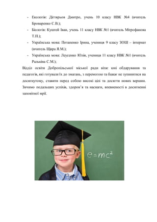 - Біологія: Куштей Іван, учень 11 класу НВК №1 (вчитель Мітрофанова