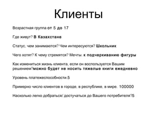 Документ обсуждает потребности и проблемы учеников в возрасте от 5 до 17 лет в Казахстане, особенно в контексте уменьшения тяжести книг, которые они обязаны носить. Рассматриваются возрастная группа, уровень платежеспособности и возможные последствия для здоровья, если не решить проблему. Также упоминается разница в подходах к решению данной проблемы и их недостатки.