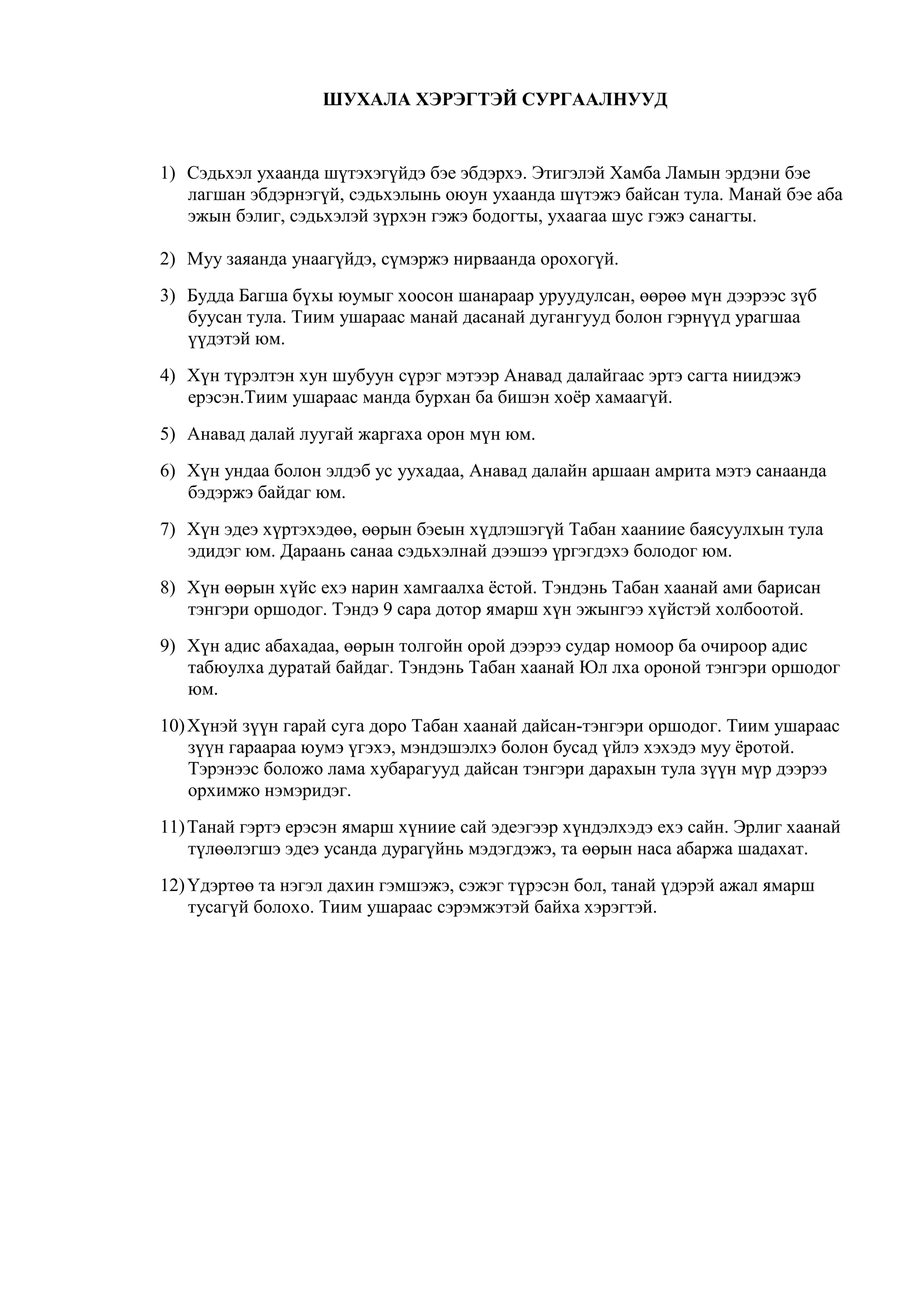 Сэдьхэл ухаанда шүтэхэгүйдэ бэе эбдэрхэ. Этигэлэй Хамба Ламын эрдэни бэе лагшан эбдэрнэгүй, сэдьхэлынь оюун ухаанда шүтэжэ байсан тула. Манай бэе аба эжын бэлиг, сэдьхэлэй зүрхэн гэжэ бодогты, ухаагаа шус гэжэ санагты. 2) Муу заяанда унаагүйдэ, сүмэржэ нирваанда орохогүй. 3) Будда Багша бүхы юумыг хоосон шанараар уруудулсан, өөрөө мүн дээрээс зүб буусан тула. Тиим ушараас манай дасанай дугангууд болон гэрнүүд урагшаа үүдэтэй юм. 4) Хүн түрэлтэн хун шубуун сүрэг мэтээр Анавад далайгаас эртэ сагта ниидэжэ ерэсэн.Тиим ушараас манда бурхан ба бишэн хоёр хамаагүй. 5) Анавад далай луугай жаргаха орон мүн юм. 6) Хүн ундаа болон элдэб ус уухадаа, Анавад далайн аршаан амрита мэтэ санаанда бэдэржэ байдаг юм. 7) Хүн эдеэ хүртэхэдөө, өөрын бэеын хүдлэшэгүй Табан хааниие баясуулхын тула эдидэг юм. Дараань санаа сэдьхэлнай дээшээ үргэгдэхэ болодог юм. 8) Хүн өөрын хүйс ехэ нарин хамгаалха ёстой. Тэндэнь Табан хаанай ами барисан тэнгэри оршодог. Тэндэ 9 сара дотор ямарш хүн эжынгээ хүйстэй холбоотой. 9) Хүн адис абахадаа, өөрын толгойн орой дээрээ судар номоор ба очироор адис табюулха дуратай байдаг. Тэндэнь Табан хаанай Юл лха ороной тэнгэри оршодог юм. 10)Хүнэй зүүн гарай суга доро Табан хаанай дайсан-тэнгэри оршодог. Тиим ушараас зүүн гараараа юумэ үгэхэ, мэндэшэлхэ болон бусад үйлэ хэхэдэ муу ёротой. Тэрэнээс боложо лама хубарагууд дайсан тэнгэри дарахын тула зүүн мүр дээрээ орхимжо нэмэридэг. 11)Танай гэртэ ерэсэн ямарш хүниие сай эдеэгээр хүндэлхэдэ ехэ сайн. Эрлиг хаанай түлөөлэгшэ эдеэ усанда дурагүйнь мэдэгдэжэ, та өөрын наса абаржа шадахат. 12)Үдэртөө та нэгэл дахин гэмшэжэ, сэжэг түрэсэн бол, танай үдэрэй ажал ямарш тусагүй болохо. Тиим ушараас сэрэмжэтэй байха хэрэгтэй.