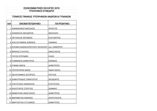 ΑΘΑΝΑΣΑΚΗΣ ΝΙΚΟΛΑΟΣ ΧΡΗΣΤΟΣ 2 ΑΘΑΝΑΣΟΣ ΘΕΟΔΩΡΟΣ ΝΙΚΟΛΑΟΣ 3 ΑΚΤΣΙΑΛΗΣ ΑΝΤΩΝΙΟΣ ΕΛΕΥΘΕΡΙΟΣ 4 ΑΛΕΞΟΓΙΑΝΝΗΣ ΚΩΝ/ΝΟΣ ΙΩΑΝΝΗΣ 5 ΑΛΠΑΚΗ-ΔΑΣΚΑΛΟΠΟΥΛΟΥ ΚΑΛΛΙΟΠΗ συζ. ΖΑΦΕΙΡΙΟΥ 6 ΒΡΕΚΟΣ ΣΤΑΥΡΟΣ ΑΝΑΣΤΑΣΙΟΣ 7 ΓΑΤΟΣ ΣΠΥΡΙΔΩΝ ΗΛΙΑΣ 8 ΓΙΑΝΝΑΚΟΣ ΔΗΜΗΤΡΙΟΣ ΚΩΝ/ΝΟΣ 9 ΓΙΑΝΝΗ ΜΑΡΙΑ ΔΗΜΗΤΡΙΟΣ 10 ΓΚΟΥΝΤΑΡΑΣ ΒΑΪΟΣ ΑΝΑΣΤΑΣΙΟΣ 11 ΔΕΛΗΓΙΑΝΝΗΣ ΣΩΤΗΡΙΟΣ ΠΑΥΛΟΣ 12 ΔΗΜΗΤΡΙΑΔΗΣ ΠΑΝΑΓΙΩΤΗΣ ΘΕΟΔΩΡΟΣ 13 ΖΛΑΤΟΥΔΗΣ ΑΘΑΝΑΣΙΟΣ ΕΥΑΓΓΕΛΟΣ 14 ΚΑΛΟΓΗΡΟΣ ΣΤΕΡΓΙΟΣ ΙΩΑΝΝΗΣ 15 ΜΑΜΟΥΧΑΣ ΑΝΑΣΤΑΣΙΟΣ ΔΗΜΗΤΡΙΟΣ 16 ΜΑΡΑΒΕΓΙΑΣ ΚΩΝ/ΝΟΣ ΑΡΙΣΤΟΤΕΛΗΣ 17 ΜΑΡΓΑΡΙΤΗΣ ΣΤΥΛΙΑΝΟΣ ΔΗΜΗΤΡΙΟΣ ΕΣΩΚΟΜΜΑΤΙΚΕΣ ΕΚΛΟΓΕΣ 2016 ΥΠΟΨΗΦΙΟΙ ΣΥΝΕΔΡΟΙ ΓΕΝΙΚΟΣ ΠΙΝΑΚΑΣ ΥΠΟΨΗΦΙΩΝ ΑΝΔΡΩΝ & ΓΥΝΑΙΚΩΝ