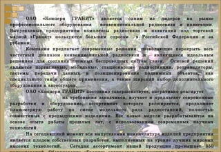 ОАО «Концерн Гранит» является ведущим производителем профессионального радиосвязного и навигационного оборудования в России. Предприятие предлагает широкий ассортимент современных радиостанций и дополнительного оборудования, обеспечивающего надежную беспроводную связь в различных условиях. Все изделия разрабатываются на основе передовых технологий и соответствуют высоким стандартам качества.