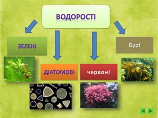 •Розглянути характеристики діатомових, бурих, червоних та зелени