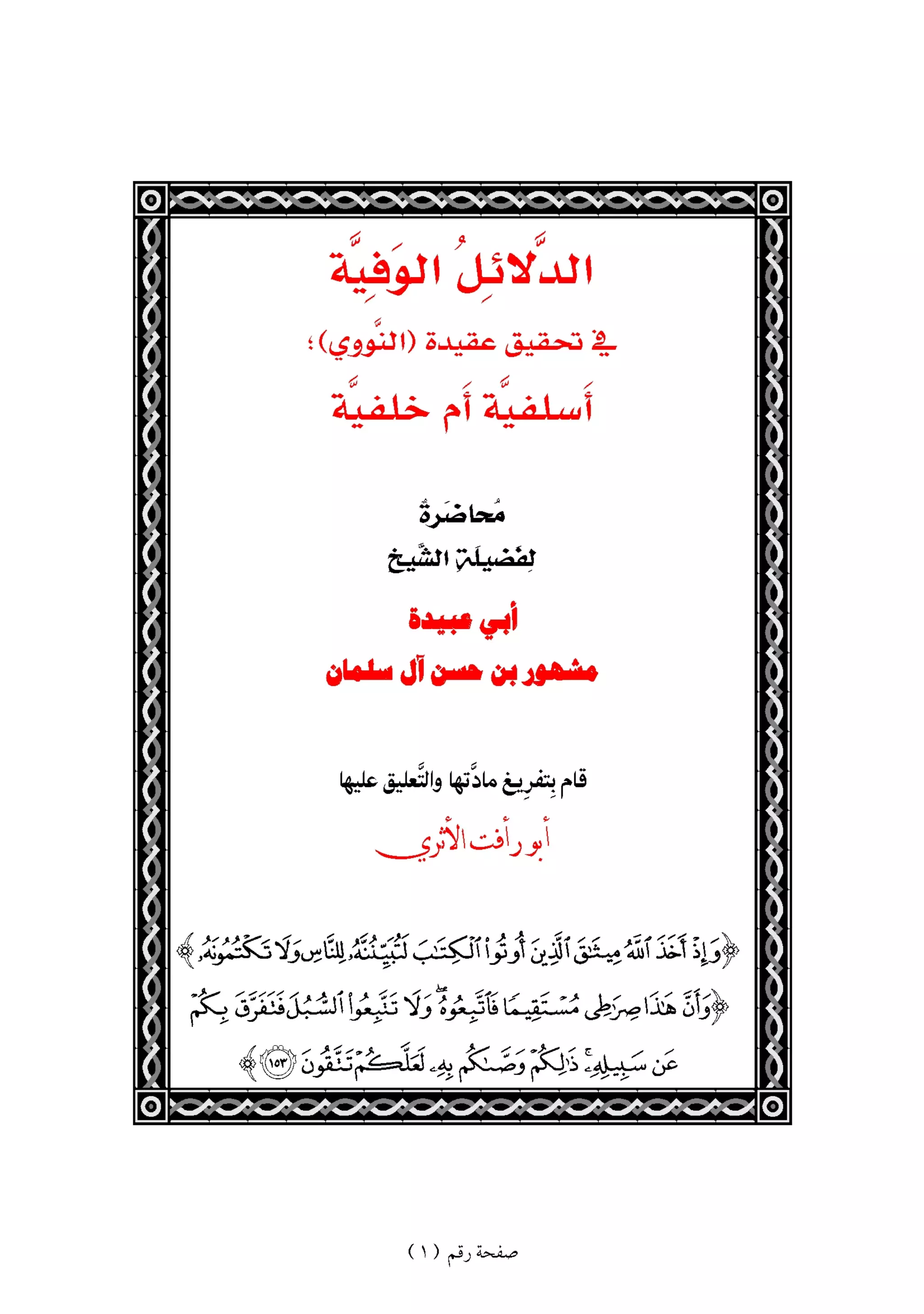 الدلائل الوفية في تحقيق عقيدة الإمام النووي : أسلفية أم خلفية المؤلف مشهور بن حسن آل سلمان دار النشر الدار الأثرية تاريخ النشر 2008مـ / 1429هـ رقم الطبعة الأولى