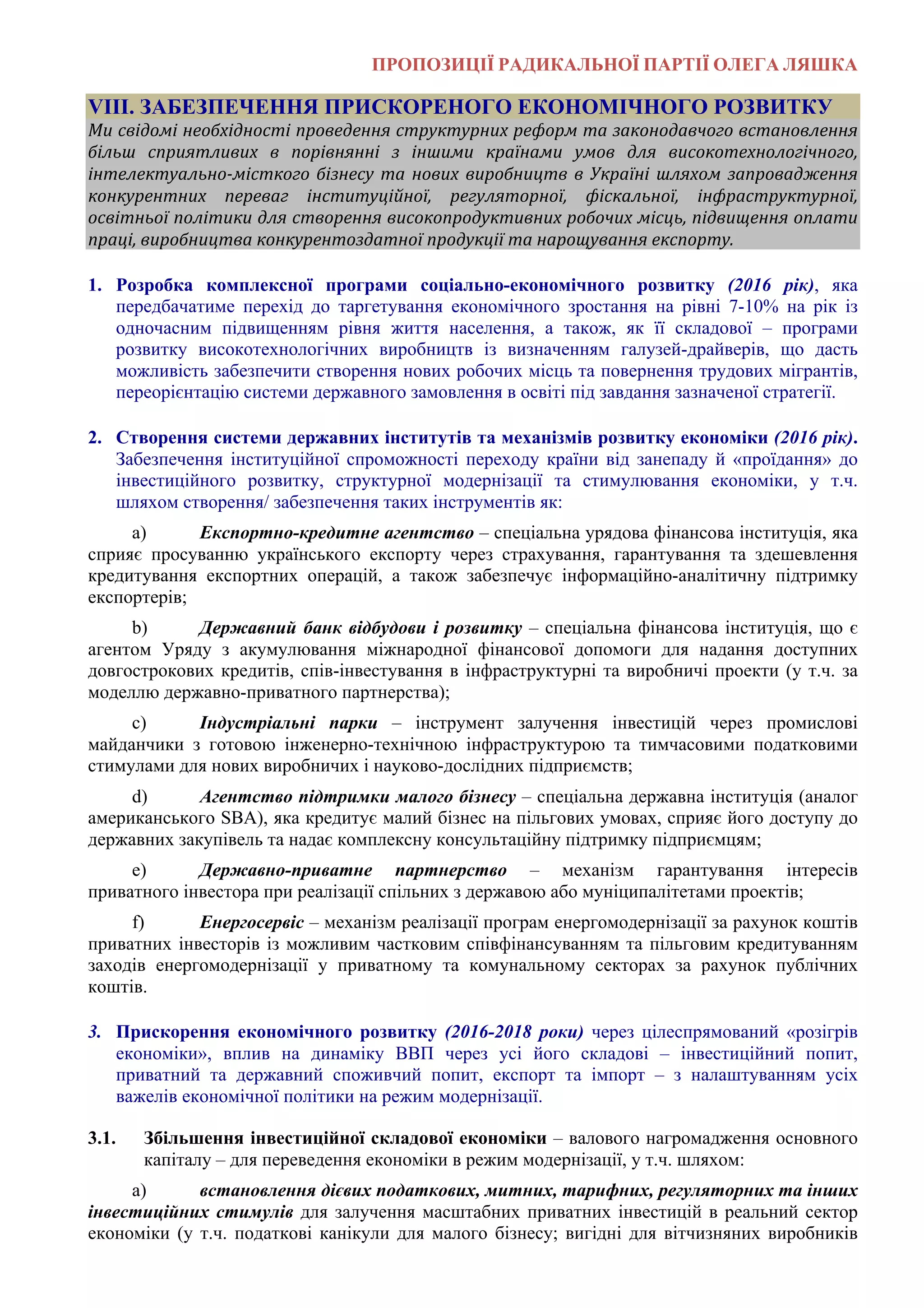 VIII. ЗАБЕЗПЕЧЕННЯ ПРИСКОРЕНОГО ЕКОНОМІЧНОГО РОЗВИТКУ