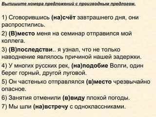 Документ содержит задания на определение предлогов, производных предлогов и их правильного употребления в предложениях. Включены примеры предложений с союзами и местоимениями, а также уточнения по написанию предлогов через дефис и слитно. Также рассматривается использование сочетаний 'зато', 'тоже' и 'чтобы' в различных контекстах.