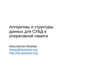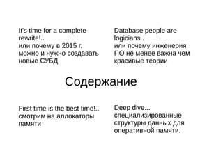 Документ охватывает современные алгоритмы и структуры данных для систем управления базами данных в оперативной памяти, подчеркнув важность атомарности, совместимости, изоляции и долговечности транзакций. Рассматриваются проблемы блокировок и подходы к параллелизму, такие как модель актеров и алгоритмы wait-free. Важное внимание уделяется специализированным аллокаторам памяти и структурам данных, обеспечивающим высокую производительность и низкую задержку.
