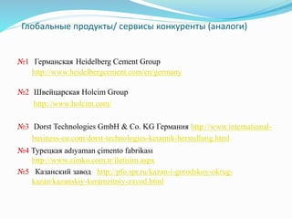 Документ описывает завод по производству строительных материалов на основе нетрадиционного сырья 'экостройсервис', включая информацию о конкурентах, как глобальных, так и региональных. Перечислены основные компании-конкуренты и их характеристики, такие как цена и качество продукции. Также представлена карта конкурентов с указанием уровня угрозы для 'экостройсервис' в контексте конкуренции.