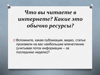 Документ описывает создание доступного информационного пространства в интернете и ведение личного блога как средство самовыражения. Автор делится личным опытом ведения блога, его особенностями и важностью уникального контента, а также мифами о необходимости определённых навыков для успешного блогинга. Блог стал площадкой для обсуждения тем влияния ВИЧ/СПИДа и выражения личных переживаний автора.