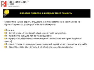 Документ представляет собой практическое пособие по технологии sous-vide, написанное экспертом с большим опытом в данной области. Основное внимание уделяется вопросам пищевой безопасности, а также важности строгого соблюдения технологий и температурного контроля при приготовлении пищи. Автор указывает на опасности и проблемы, возникающие при неправильном использовании технологии в России, и предлагает рекомендации для ее безопасного применения.