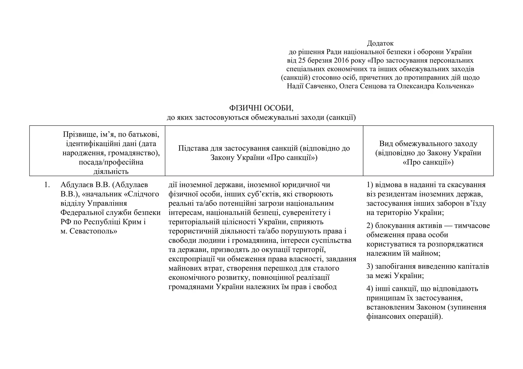 Додаток до рішення Ради національної безпеки і оборони України від 25 березня 2016 року «Про застосування персональних спеціальних економічних та інших обмежувальних заходів (санкцій) стосовно осіб, причетних до протиправних дій щодо Надії Савченко, Олега Сенцова та Олександра Кольченка»