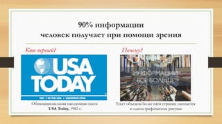 Документ обсуждает важность инфографики в передаче информации и ее эффективность по сравнению с текстом. Он описывает различные методы визуализации данных, типы данных и этапы создания инфографики. Также приводятся рекомендации по планированию работы и управлению вниманием читателя.