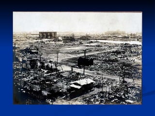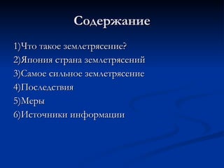 Документ описывает землетрясения в Японии, их причины, последствия и меры по их предотвращению. Япония страдает от большого количества сейсмических активностей, и наиболее мощное землетрясение произошло 1 сентября 1923 года, унесшее 143 тысячи жизней. В документе также упоминаются учения, проводимые правительством для подготовки граждан к возможным катастрофам.