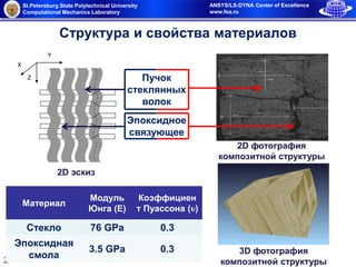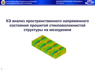 Документ описывает результаты анализа пространственного напряженного состояния стекловолокнистой структуры с использованием КЭ метода Aсnys/LS-DYNA. В нем представлены характеристики материалов, размеры модели, процесс гомогенизации, а также результаты расчетов, включая поведение конструкции под нагрузками и проверки достоверности полученных данных. В заключении приведены значения эффективного модуля Юнга и максимальных напряжений в пучках волокон.