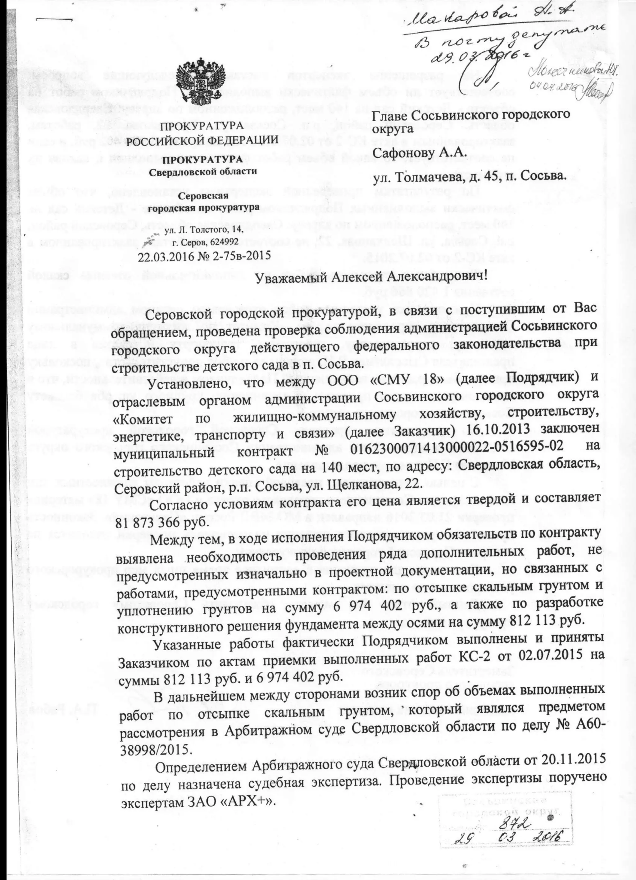 В документе рассматривается проверка серовской городской прокуратуры по жалобе на строительство детского сада в п. Сосьва. Выявлено, что объем выполненных подрядчиком работ не соответствует актам приемки, что могло привести к ущербу бюджету округа. Прокуратура направила материалы проверки в МВД для уголовно-правовой оценки действий должностных лиц и подрядчика.