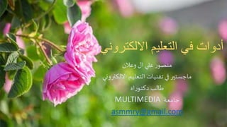 تناقش الوثيقة الأدوات والتقنيات المستخدمة في التعليم الإلكتروني، موضحة أنها تعتمد على أساليب حديثة للتواصل والتفاعل باستخدام الوسائط المتعددة. كما تستعرض أنواع الأدوات المستخدمة وتقسيمها إلى مادية وبرمجية، وتؤكد على أهمية هذه الأدوات في تحسين فعالية التعلم. الوثيقة أيضًا تتناول بعض الأنظمة المتوفرة لدعم التعليم الإلكتروني وأدوات الاختبارات على الإنترنت.
