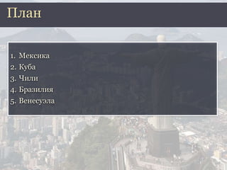 Документ описывает реформы и политические изменения в странах Латинской Америки в 20 веке, включая революции в Мексике и на Кубе, а также переход от военных диктатур к гражданскому правлению в Чили и Бразилии. Обсуждаются ключевые фигуры, такие как Фидель Кастро и Уго Чавес, а также влияние социальных программ на экономическое развитие стран. В итоге, Латинская Америка демонстрирует разнообразные пути развития, от социалистического до реформаторского.