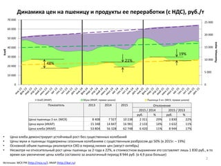Документ содержит анализ затрат на производство пшеницы, ценообразование на удобрения и динамику цен на пшеницу и продукты её переработки за 2015-2016 годы. Основной вывод заключается в том, что цена пшеницы за два года выросла на 22%, однако это всего лишь 1 830 руб., в то время как цена хлеба увеличилась на 8 944 руб. и другие удобрения подорожали значительно сильнее, что подчеркивает слабую окупаемость производства пшеницы.