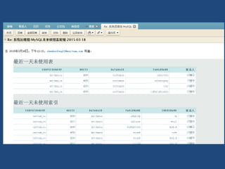 本文档介绍了美团数据库运维平台的各个组件,包括自动化运维、慢查询系统和备份系统等。提供了使用Percona工具的经验和Redis集群的管理技巧,以及运维报表的生成与容量管理的方法。文档强调了监控和历史数据分析在数据库管理中的重要性。