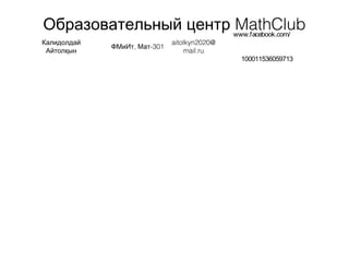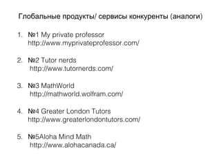 Документ описывает образовательный центр MathClub и его конкурентное положение на рынке. Приведены ссылки на основные конкуренты и их продукты, а также проведен анализ ценового и качественного позиционирования. Кроме того, рассмотрены стратегические угрозы и возможности для развития, включая идеи и привлечение инвестиций.