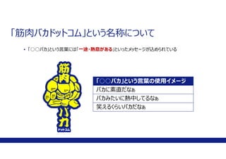 「筋肉バカドットコム」という名称について ▪ 「○○バカ」という⾔葉には「一途・熱意がある」といったメッセージが込められている 「○○バカ」という⾔葉の使⽤イメージ バカに素直だなぁ バカみたいに熱中してるなぁ 笑えるくらいバカだなぁ