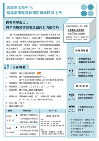 本系列研習以「家庭生活為中心」和「跨專業團隊實務運用」為主題,提供早期療育專業人員與家庭溝通的技能培訓。第一場研習將於5月17日舉行,重點在於與早期療育家庭的會談諮詢及溝通技巧。報名將於研習日前一個月開放,相關信息可在早療專業人員資源網查詢。