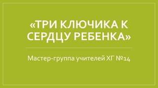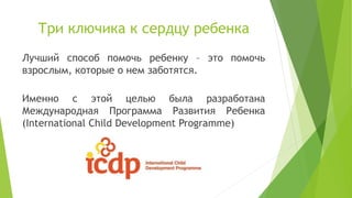 Документ описывает мастер-группу учителей, прошедшую 8 апреля 2016 года, посвященную методам поддержки детей через помощь их взрослым опекунам. Основное внимание уделяется международной программе развития ребенка, которая направлена на важность взаимодействия с заботящимися взрослыми. Основная идея заключается в том, что лучший способ помочь ребенку — это помочь взрослым.