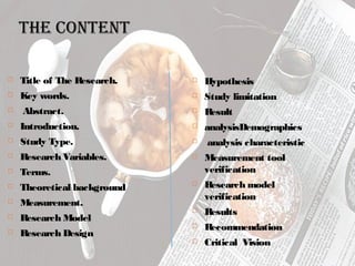 This study aimed to compare how cinemagraph images and general images influence purchase intention for online food marketing. The researchers hypothesized that perceived monetary value, brand attitude, and perceived taste would positively influence purchase intention, and that there would be differences between groups viewing cinemagraphs versus general images. 142 participants viewed food images as either cinemagraphs or general images and completed surveys on perception measures and purchase intention. Results supported all hypotheses - the perception factors positively influenced intention for both groups, and the cinemagraph group was more influenced by monetary value while the general image group was more influenced by brand. The study thus provided insights into how different image types can shape online food marketing.