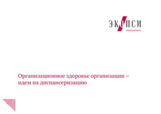 Документ описывает модели диагностики организационного здоровья, разработанные 'экопси консалтинг'. Приведены ключевые факторы, влияющие на здоровье организации, и примеры результатов диагностики, указывающие на проблемы в управлении и культуру. Также указаны ресурсы и контактная информация для дальнейшего изучения темы.