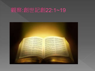 神說:「你帶著你的兒子,就是你獨生的兒子,你所愛的以 撒,往摩利亞地去,在我所要指示你的山上,把他獻為燔祭。」 22:3 亞伯拉罕清早起來,備上驢,帶著兩個僕人和他兒子以撒,也 劈好了燔祭的柴,就起身往 神所指示他的地方去了。 22:4 到了第三日,亞伯拉罕舉目遠遠地看見那地方。