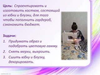 Документ описывает проектирование и изготовление летнего костюма для девочки-подростка, включающего юбку и блузку с учетом бюджетных ограничений. В нем представлены этапы создания, выбор тканей и материалов, а также анализ цветотипа и свойства тканей. Также содержится информация о себестоимости и процессе пошива изделия.