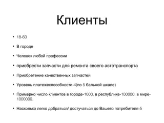 Документ описывает продажу автозапчастей и целевую аудиторию, которая включает людей в возрасте от 18 до 60 лет, проживающих в городе. Основными проблемами клиентов являются недостаток информации о фирме и отсутствие качественных запчастей. Также упоминается уровень платежеспособности и срочности потребностей клиентов.