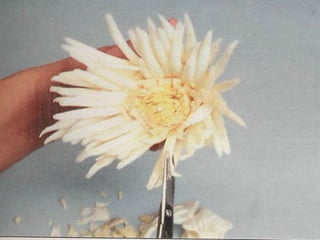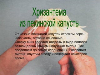 Карвинг — это искусство художественной резки фруктов и овощей, которое возникло на Востоке и стало частью национальных традиций. В документе описываются техники создания украшений из овощей, таких как водяная лилия и кувшинка, с пошаговыми инструкциями по резке и формированию лепестков. Повар не только готовит, но и эстетически оформляет блюда перед подачей на стол.