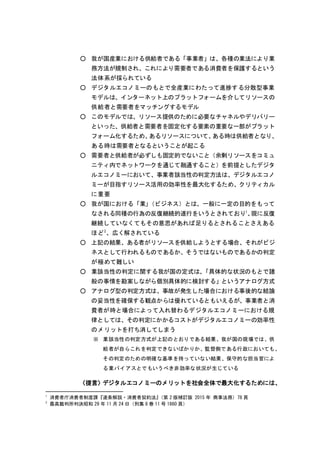 ○ 我が国産業における供給者である「事業者」は、各種の業法により業 務方法が規制され、これにより需要者である消費者を保護するという 法体系が採られている ○ デジタルエコノミーのもとで全産業にわたって進捗する分散型事業 モデルは、インターネット上のプラットフォームを介してリソースの 供給者と需要者をマッチングするモデル ○
