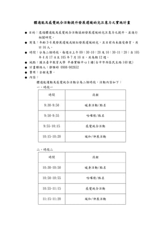 本計畫旨在透過體適能及感覺統合活動提升發展遲緩幼兒的注意力,共16名3至6歲幼兒參加,為期12周,每週兩個時段進行活動,地點在國立臺中教育大學早療實驗中心。所有活動均免費,包含暖身、哈囉歌、感覺統合及緩和伸展活動。聯絡人為鄒雅婷,可透過電話0908-902652聯繫。
