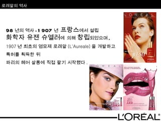 로레알의 경쟁 기업THE ESTEE LAUDER COMPANIES ( 에스티 로더 그룹 ) 1946 년 , 미국 뉴욕에서 에스티 로더 여사에 의해 탄생 전세계적으로 150 여 개 국가에 1 만 4 천개 매장을 오픈 1991 년 에스티 로더 한국 지사가 설립 전국 60 여개의 유명 백화점 등에 입점 외국 화장품 부문 매출 1 위를 기록